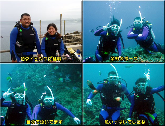 コウさんは毎年1回は潜ってるとのことですが、ユミさんは始めて。まずは水慣れしていただく為にスノーケリングでちょっと水中を覗いていただきました。 始めて見る水中の景観に感動されたようで、すぐに慣れて楽しんでました。