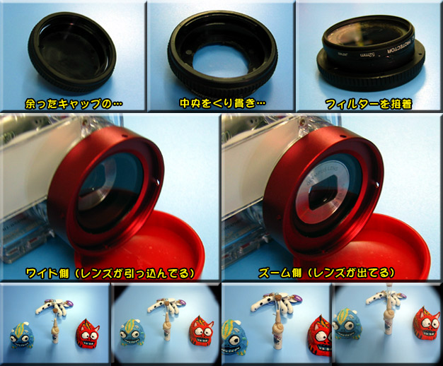 で瞬殺されたワイコンテストに変わってクローズアップレンズのテスト。前回(10/25)のテストで5倍ズームの威力を発揮するにはどうしてもクローズアップレンズが必要とのことで探しているのですが、中々いいものがない。 で、以前使ってたKENKOのマクロレンズを装着できないか、と径を合わせるため52-37mmのステップダウンリングを入手。こいつでPT-039のレンズポートに装着しました。